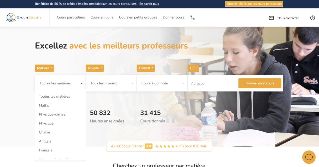 Tout comme le site Edulide, Groupe Réussite s’adresse aux lycéens qui préparent les concours grandes écoles. Vous avez la possibilité d’enseigner un seul apprenant ou bien un groupe restreint. Les matières comprennent les langues (français, anglais, espagnol), les mathématiques, physique, SVT, chimie, SES, Histoire-Géographie, informatique et Sciences de l’ingénieur. Concernant la rémunération, vous avez le choix entre deux options : soit vous fixez vous-même vos tarifs soit vous travaillez en tant que salarié. Si vous choisissez la seconde option, sachez que vous toucherez 17 euros de l’heure si vous donnez des cours de collège. Si vous encadrez un lycéen, ce sera 20 euros par heure et pour des cours de prépa, comptez 28 € par heure.