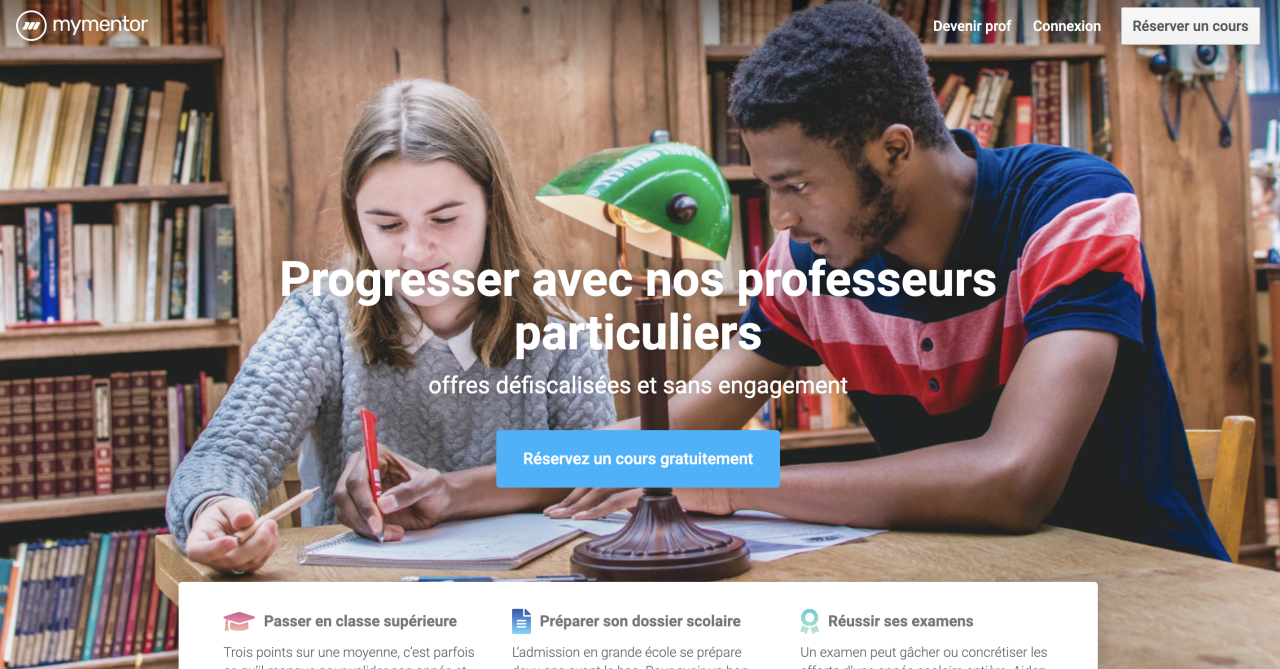 Mymentor se classe parmi les meilleurs quand il s’agit de donner des cours particuliers. Les matières que vous pouvez enseigner sont nombreuses : français, anglais, chimie, mathématiques, histoire… À travers ce site, vous prodiguez un enseignement de qualité à des lycéens, collégiens ou bien à des universitaires. Votre rémunération varie en fonction de deux paramètres à savoir la matière et la durée. Il faut savoir qu’une commission (10%) sera prélevée sur vos cours. Si vous êtes partant, votre inscription passe obligatoirement par le remplissage d’un formulaire.